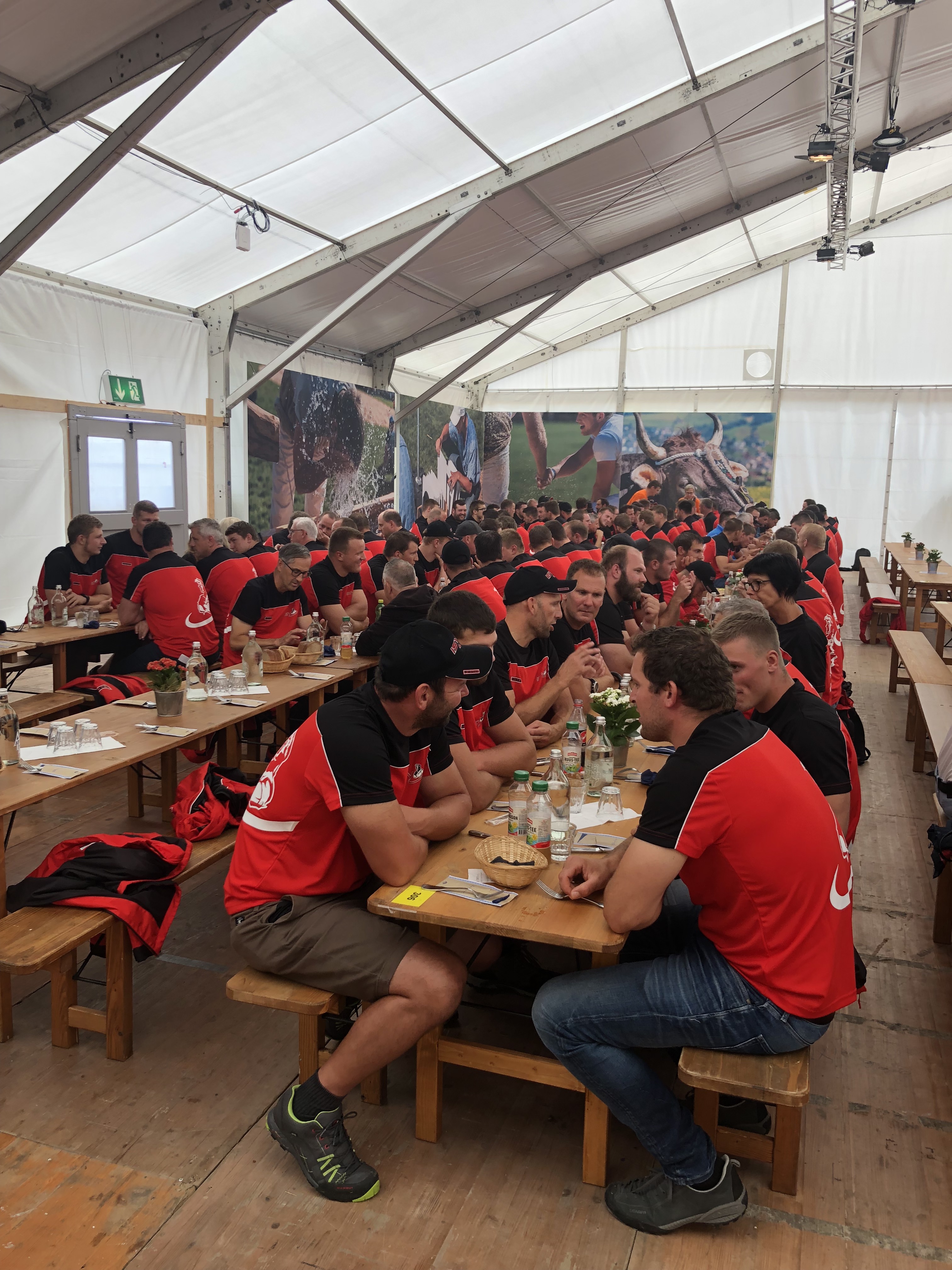 Zu einem Gabentempel gehört am ESAF auch eine ordentliche Gabenbeiz. In dieser nahm ich ein feines Mittagessen ein, genau wie das 85-köpfige Team der Innerschweizer Schwinger. Diese hatten just an jenem Tag einen Team-Event auf dem Festgelände und wurden überdies für das ESAF eingekleidet.