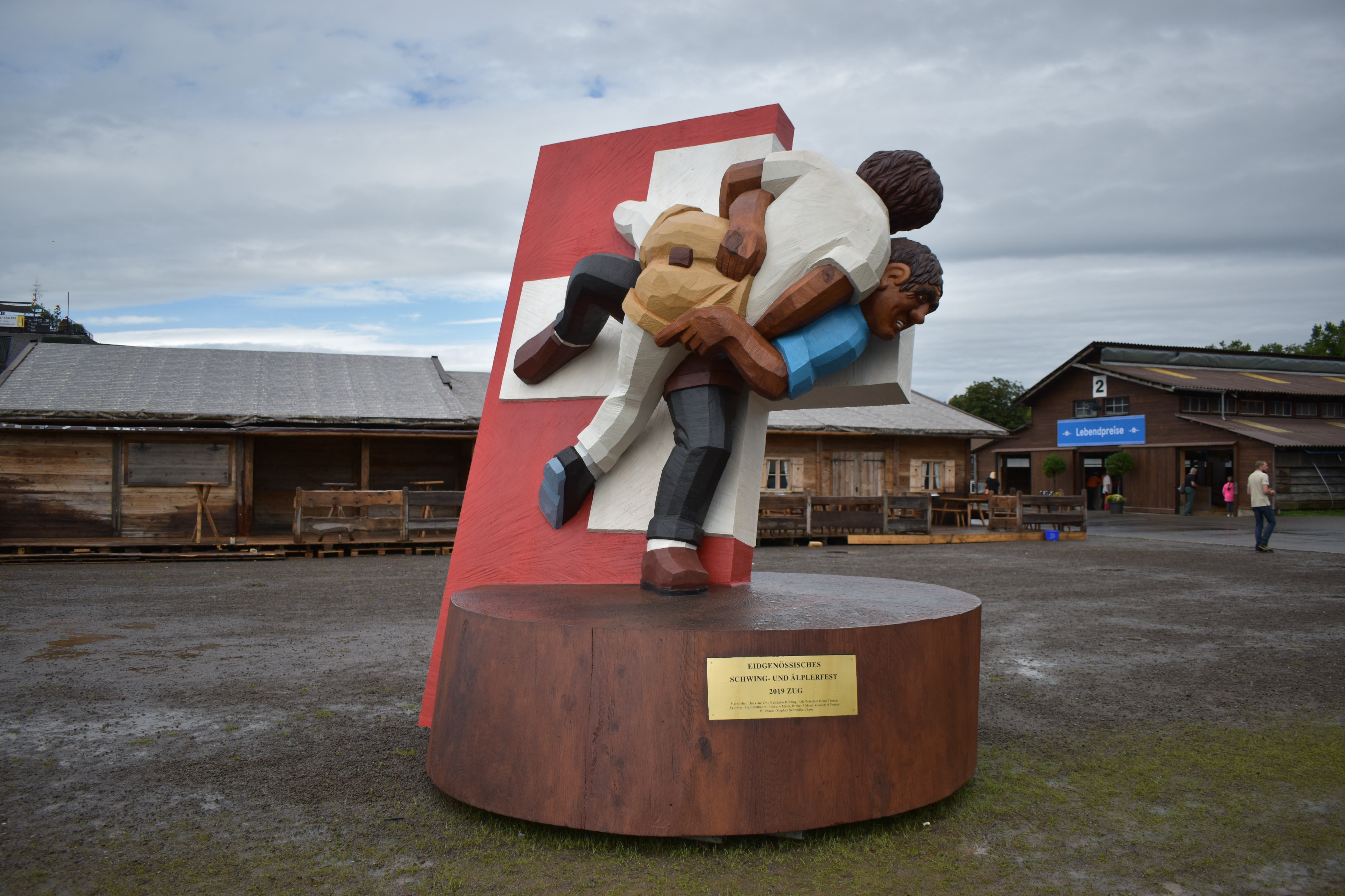Die vom Künstler Stephan Schmidlin erschaffene ESAF-Skulptur befindet sich auf dem Vorplatz des Gabentempels und der Gabenbeiz. Ein schmuckes Teil, und sie ist eindrücklich. Folgendes fand ich dazu in der Luzerner Zeitung: «Die Skulptur ist vier Meter hoch und drei Meter breit, auf einem Sockel aus Holz mit rund drei Meter Durchmesser und zehn Tonnen schwer.»