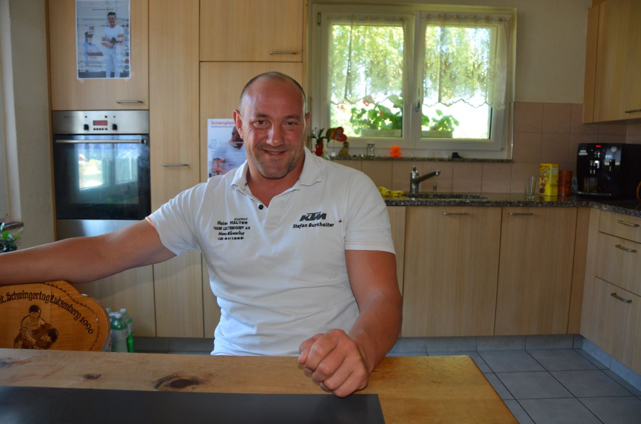 Der Turnerschwinger Stefan Burkhalter könnte bereits schon an diesem Sonntag beim Rigi-Schwinget zum erlauchten Hunderterklub aufsteigen. Diesem gehören bisher 22 Schwinger an. Ein Kranzgewinn fehlt dem Thurgauer dazu noch. Den 99. Kranz erkämpfte sich der 43-Jährige kürzlich beim Nordostschweizerischen Teilverbandsfest in Davos. Diese Ausgangslage war für mich Grund genug, am Dienstag dieser Woche nach Homburg TG zu fahren und den ältesten noch aktiven Eidgenossen zu besuchen. Im Gespräch konfrontierte ich „Burki“, wie er von seinen Fans genannt wird, mit zehn Stichworten.